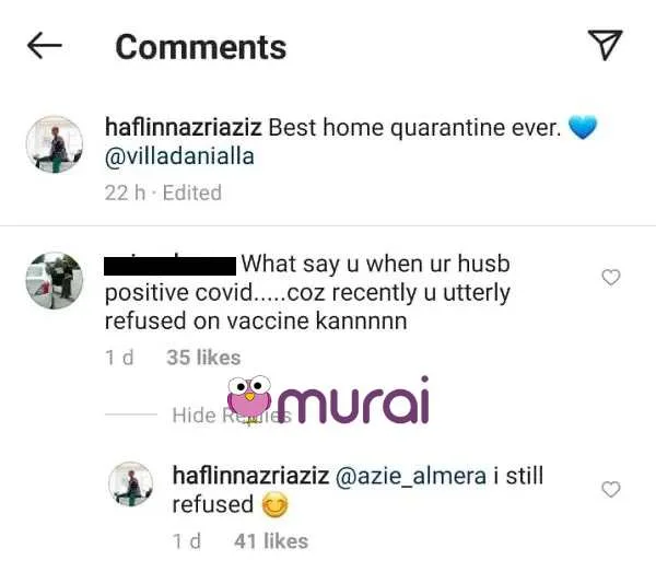 Terdahulu, nama Haflin hangat diperkatakan di media sosial berikutan dirinya enggan menerima vaksin biarpun suaminya telah disahkan positif COVID-19.