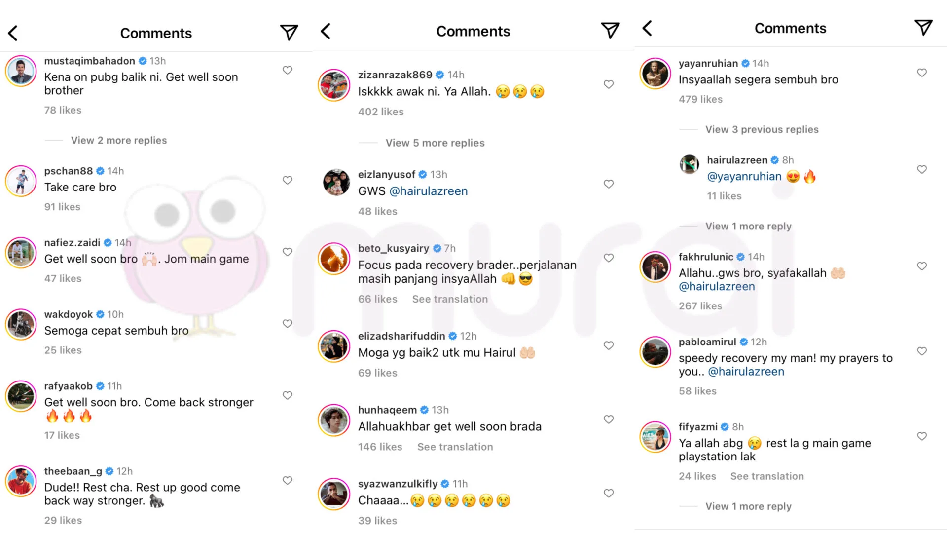Di ruangan komen, rata-rata peminat dan rakan selebriti seperti Yayan Ruhian, Pablo Amirul, Zizan Razak, Hun Haqeem, Siti Elizad, dan ramai lagi dilihat membanjiri komen dengan meluahkan rasa terkejut terhadap kecederaan yang berlaku pada Hairul, malah turut menitipkan doa agar diberikan kesembuhan dengan cepat.