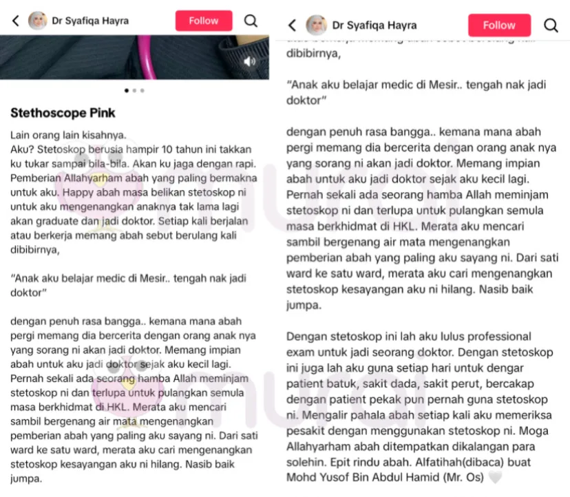 “Akan ku jaga dengan rapi. Pemberian Allahyarham abah yang paling bermakna untuk aku. Happy abah masa belikan stetoskop ni untuk aku mengenangkan anaknya tak lama lagi graduate dan jadi doktor”