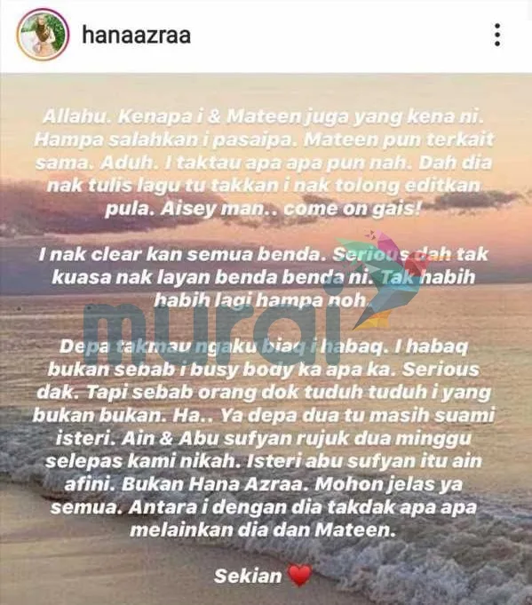 “Mohon jelas ya semua. Antara I dengan dia dah tak ada apa-apa melainkan dia dengan Mateen,” kongsi Hana menerusi akaun Instagramnya baru-baru ini.