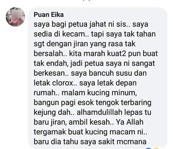 Seperti yang dilaporkan Thereporter, komen individu berkenaan tersebar di media sosial di mana dia berkongsi petua bagi mereka yang mempunyai masalah kucing di kawasan kejiranan.