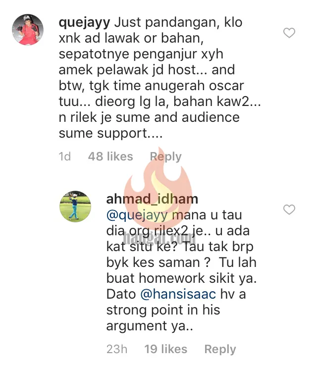 Pada malam tersebut, Zizan telah membuat lawak mengenai Datuk Hans Isaac dan Datuk Eizlan Yusof mengenai status Datuk yang dimiliki oleh mereka. Namun begitu, sewaktu kamera memfokuskan pada muka Datuk Hans Isaac, ternyata Zizan telah menyinggung perasaan pelakon dan pengarah tersebut sehingga Datuk Hans memerli kembali Zizan pada giliran beliau memberi ucapan dan anugerah.