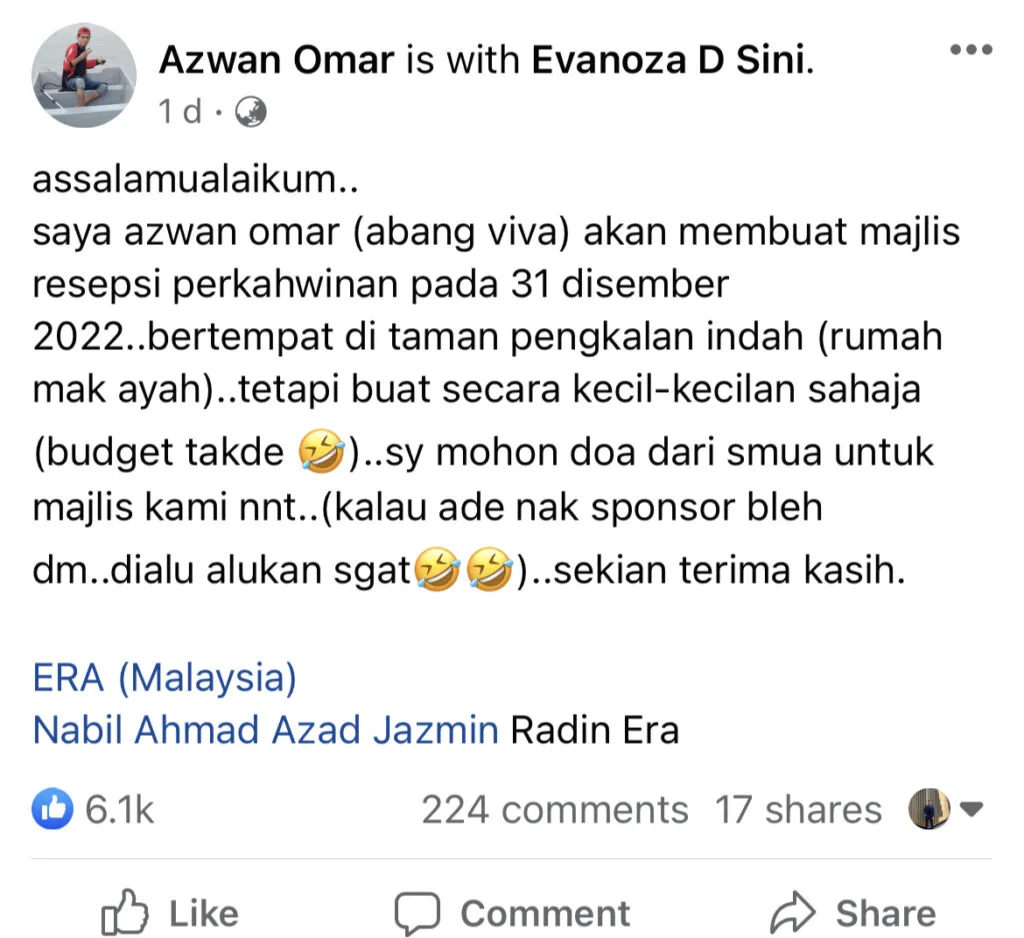 Sukarelawan terkenal, Azwan Omar atau lebih dikenali sebagai Abang Viva tampil memohon maaf dan membuat pencerahan tentang posting terdahulunya di Facebook yang meminta tajaan untuk majlis resepsinya bersama isteri pada 31 Disember ini.