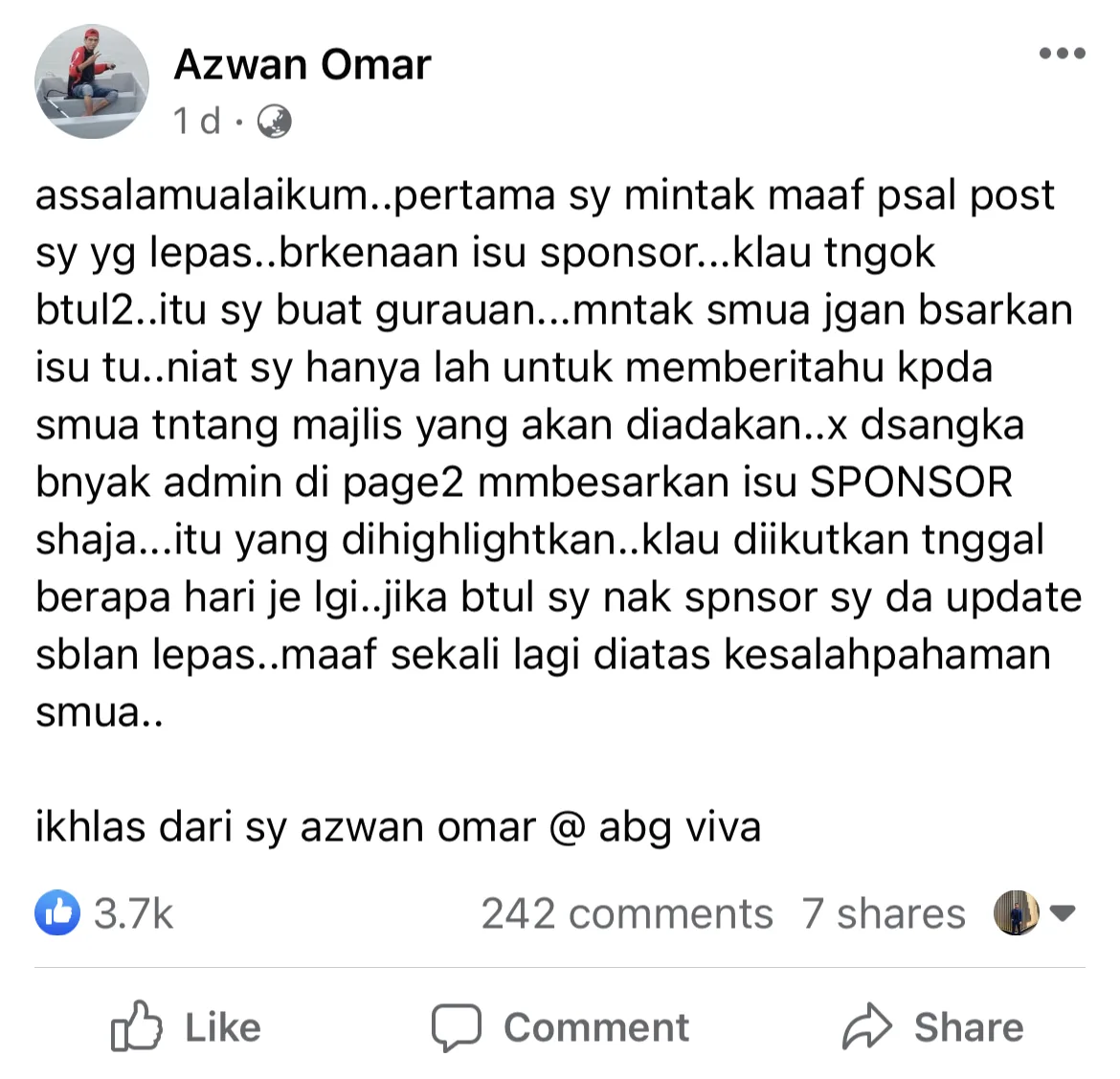 “Assalamualaikum, pertama saya minta maaf pasal posting saya yang lepas berkenaan isu sponsor. Kalau tengok betul-betul, itu saya buat teguran, minta semua jangan besarkan isu itu. Niat saya hanyalah untuk memberitahu kepada semua tentang majlis yang akan diadakan.