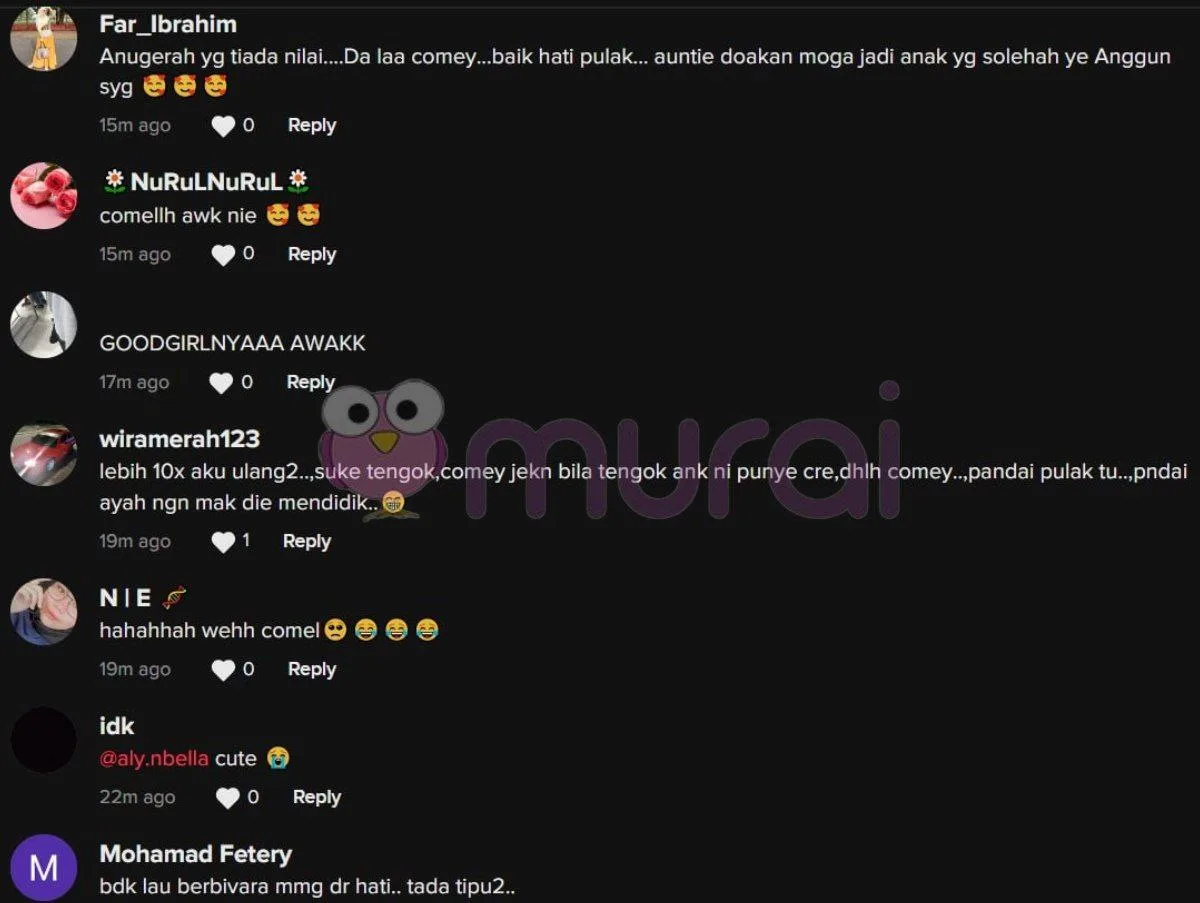 Hasil tinjauan Murai My keruangan komen video tersebut, ramai netizen kagum dengan sikap anaknya yang mempunyai rasa belas kasihan terhadap orang susah di sekelilingnya. Ada juga yang yang menitip pesan buat ayahnya untuk sentiasa mendidik anaknya dengan perkara-perkara yang baik supaya anaknya menjadi seorang anak yang baik buat keluarga dan masyarakat.