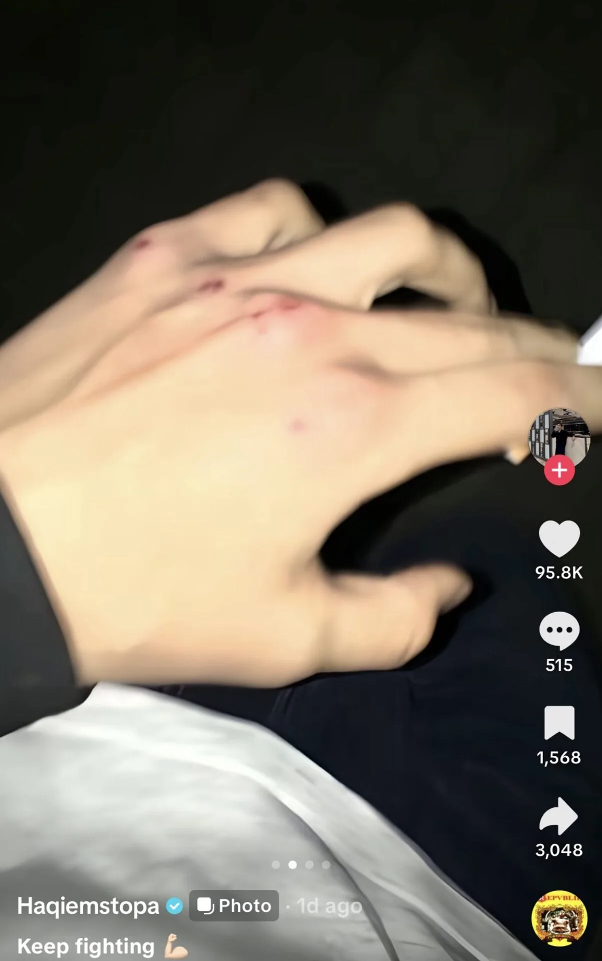 Haqiem atau nama sebenarnya Muhammad Sadzri Hakim Jaafar menerusi hantaran di TikTok, dilihat memuatnaik beberapa foto termasuklah sekeping foto yang memaparkan tangan seseorang dalam keadaan luka.
