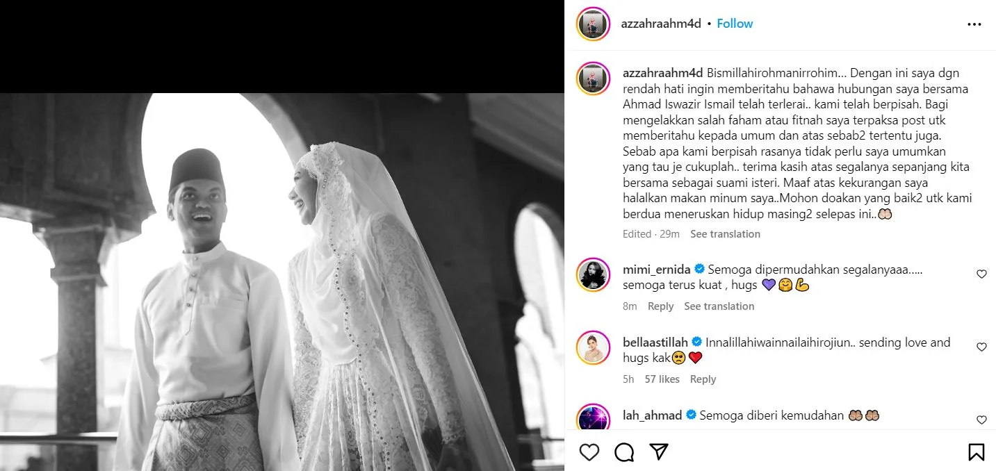 Berita penceraian itu diumum dan disahkan sendiri oleh Azzahra sendiri menerusi akaun Instagram (IG) miliknya, malam tadi.