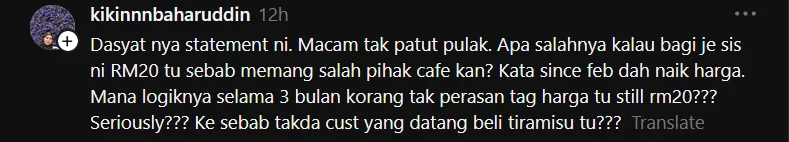 Susulan itu, pihak kafe tampil memberikan penjelasan bahawa harga sebenar produk tersebut telah lama disemak semula kepada RM25 berikutan peningkatan kos bahan mentah.