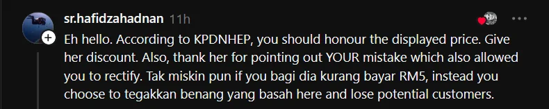 Meninjau ke ruangan komen, rata-rata netizen berpendapat bahawa isu ini tidak seharusnya dipandang remeh. Bagi mereka, ia bukan sekadar soal perbezaan RM5, tetapi melibatkan prinsip asas dalam perniagaan.