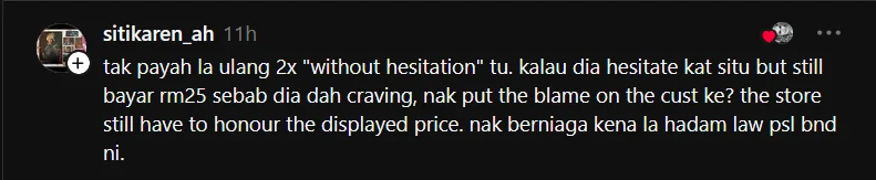 Namun, situasi berubah apabila di kaunter pembayaran, harga yang dikenakan adalah RM25. Apabila dia mempersoalkan perkara tersebut, staf memaklumkan bahawa harga RM20 adalah harga lama yang masih belum dikemas kini pada tag.