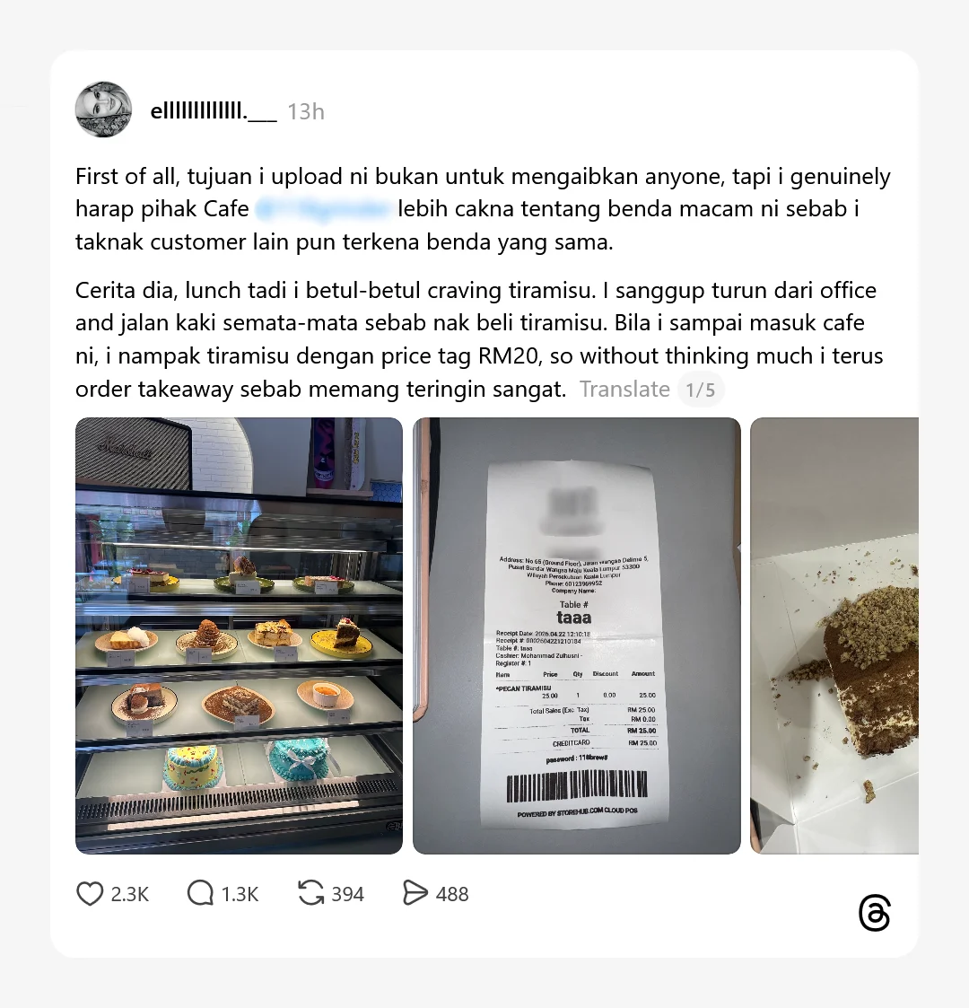 Tular di media sosial, seorang pelanggan berkongsi pengalaman kurang menyenangkan apabila dikenakan harga berbeza daripada yang dipaparkan ketika membeli tiramisu di sebuah kafe.