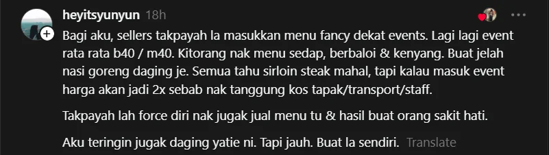 Ada yang berpendapat peniaga tidak perlu “memaksa” menjual menu premium dalam acara yang kebanyakannya dikunjungi golongan B40 dan M40.