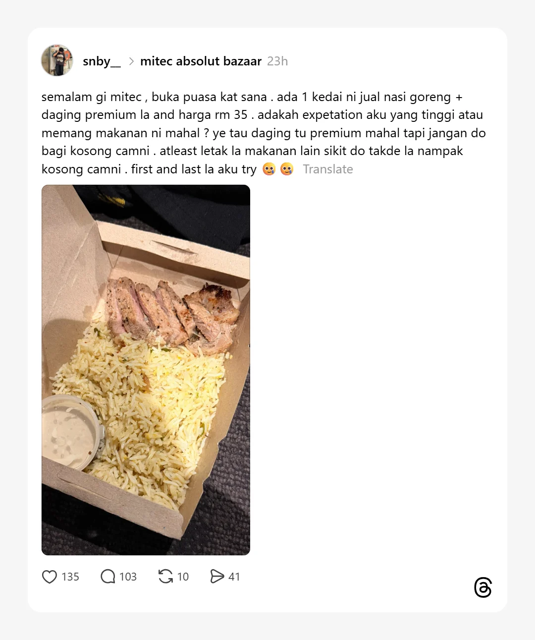 Menurut individu tersebut, dia membeli set nasi goreng bersama daging “premium” pada harga RM35. Namun, apa yang diterima didakwa sekadar nasi goreng dengan beberapa cebisan daging, tanpa sebarang tambahan lain yang boleh memberikan rasa “berbaloi”.