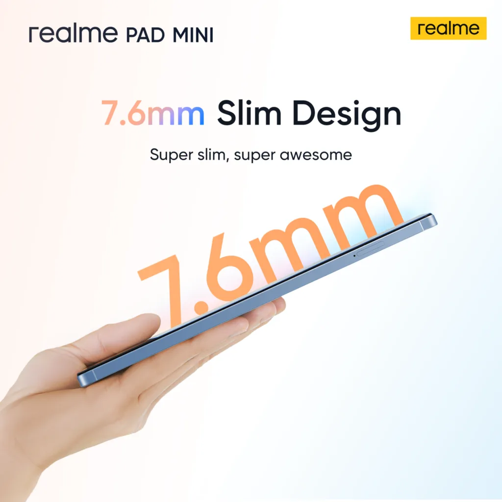 Dengan slogannya “Mini tetapi Perkasa”, realme Pad Mini menawarkan bateri berprestasi tinggi yang disematkan ke dalam badan aluminium tipis yang menggunakan reka bentuk aloi aluminium yang terkemuka dalam industri. Dengan semua ciri ini dan banyak lagi, Pad Mini menjadikannya teman sempurna setiap hari yang ringan dan selesa untuk dipegang agar sesuai dengan gaya hidup sibuk pengguna mereka.