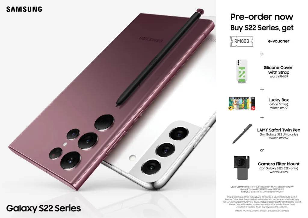 Pengguna yang membuat pra-pesanan siri Galaxy S22 akan menikmati ganjaran eksklusif bernilai sehingga RM1,317 – termasuk e-baucar bernilai sehingga RM800 untuk dibelanjakan di Kedai Dalam Talian Samsung Malaysia, Sarung Silikon dengan Tali, dan kotak bertuah yang mengandungi Silicone Cover with Strap phone case edisi terhad. Selain itu, pembeli Galaxy S22 Ultra 5G akan menerima PLAMY Safari Twin Pen. Manakala, pelanggan Galaxy S22 Plus dan Galaxy S22 akan menerima Pemasangan Filter Kamera.