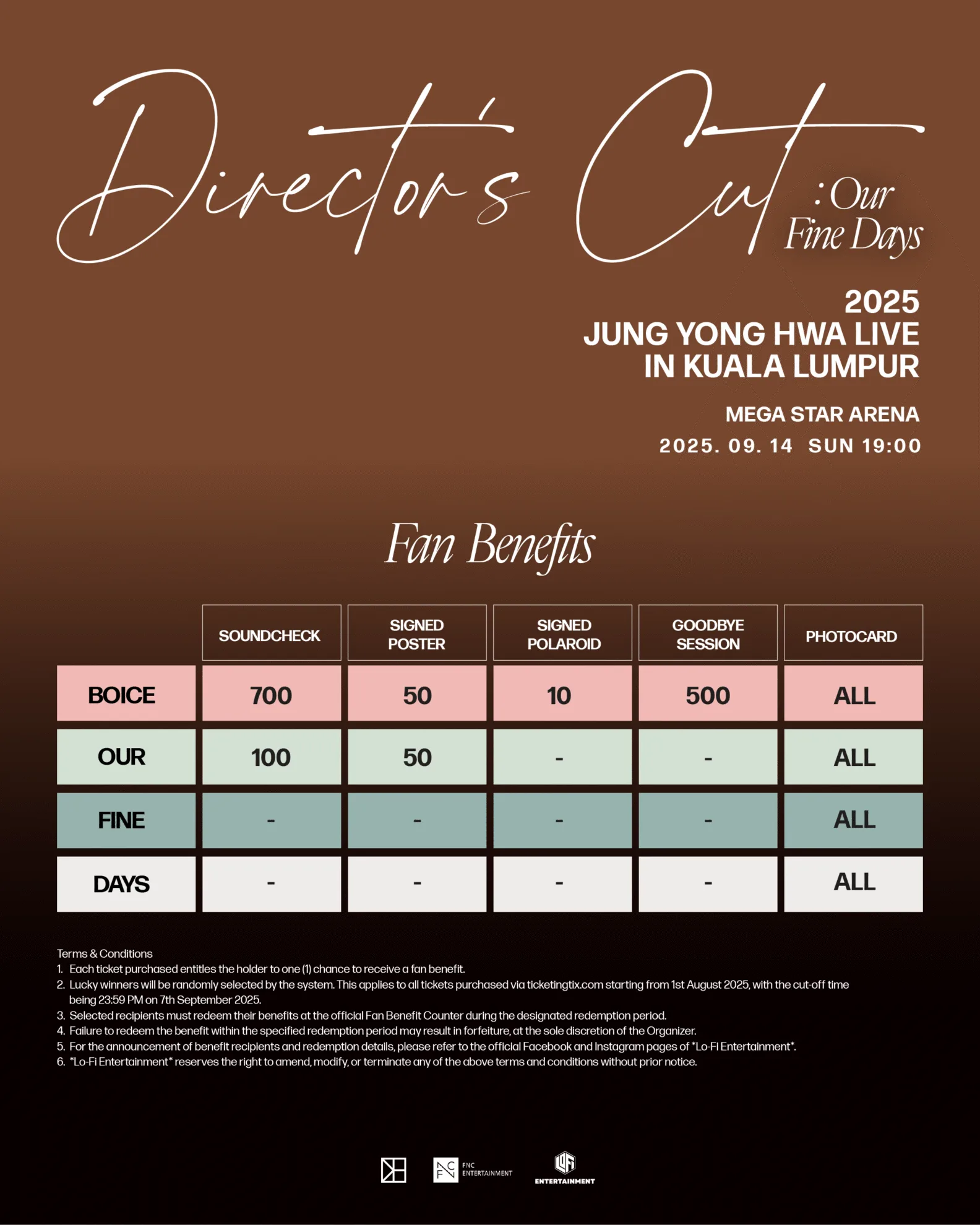 Konsert ni diberi nama 2025 JUNG YONG HWA LIVE ‘Director’s Cut: Our Fine Days’, dan akan berlangsung pada Ahad, 14 September 2025, pukul 7 malam di Mega Star Arena, KL. Konsert ni dibuat khas untuk sambut ulang tahun ke-10 debut solo Yong Hwa, sambil meraikan pelancaran mini album terbaru dia yang bertajuk One Last Day.