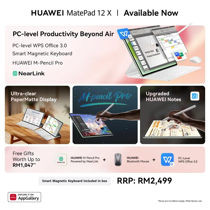 Pengguna juga bakal menerima hadiah percuma bernilai sehingga RM1,047 merangkumi M-Pencil Pro, HUAWEI Mouse dan WPS Office 3.0.