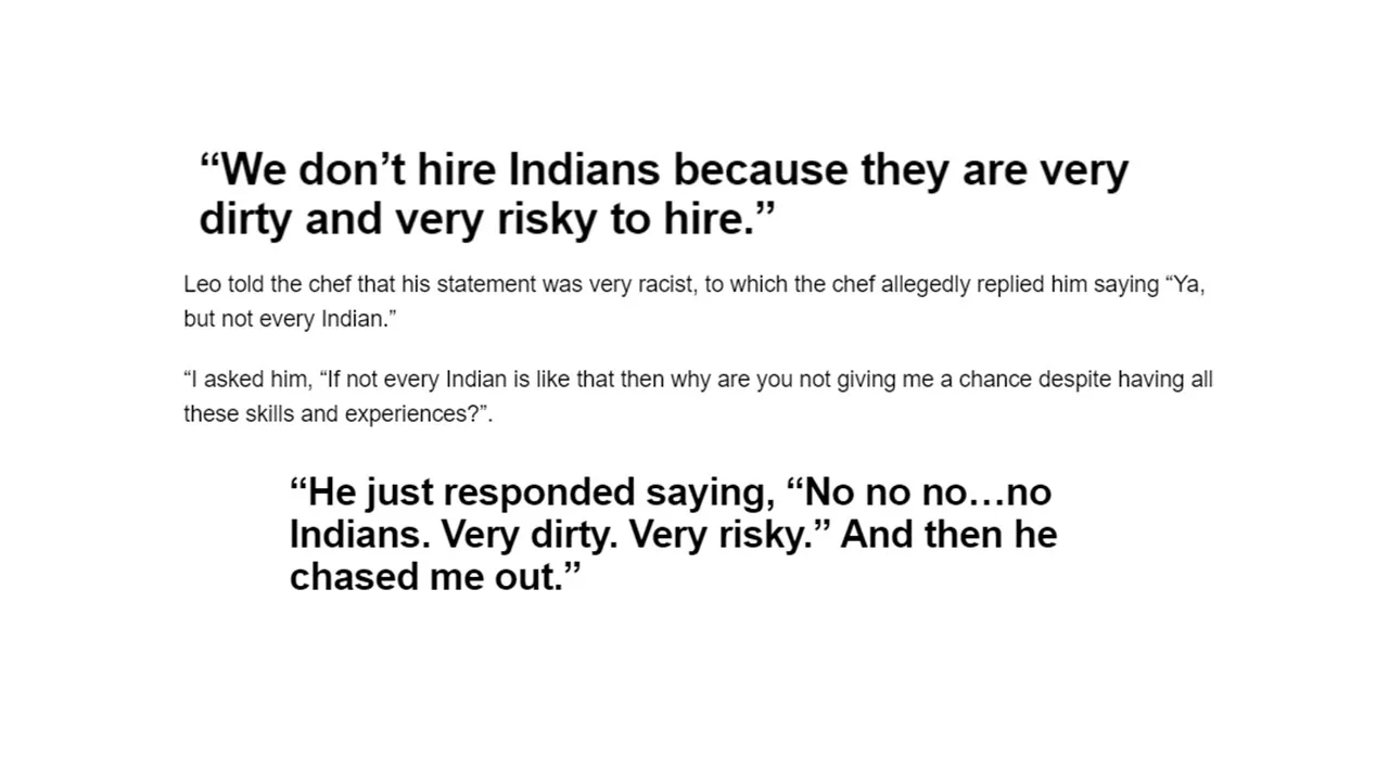 Kata Leo, pihak restoran tidak menerima orang India kerana berpendapat mereka sangat kotor dan sangat berisiko untuk direkrut.