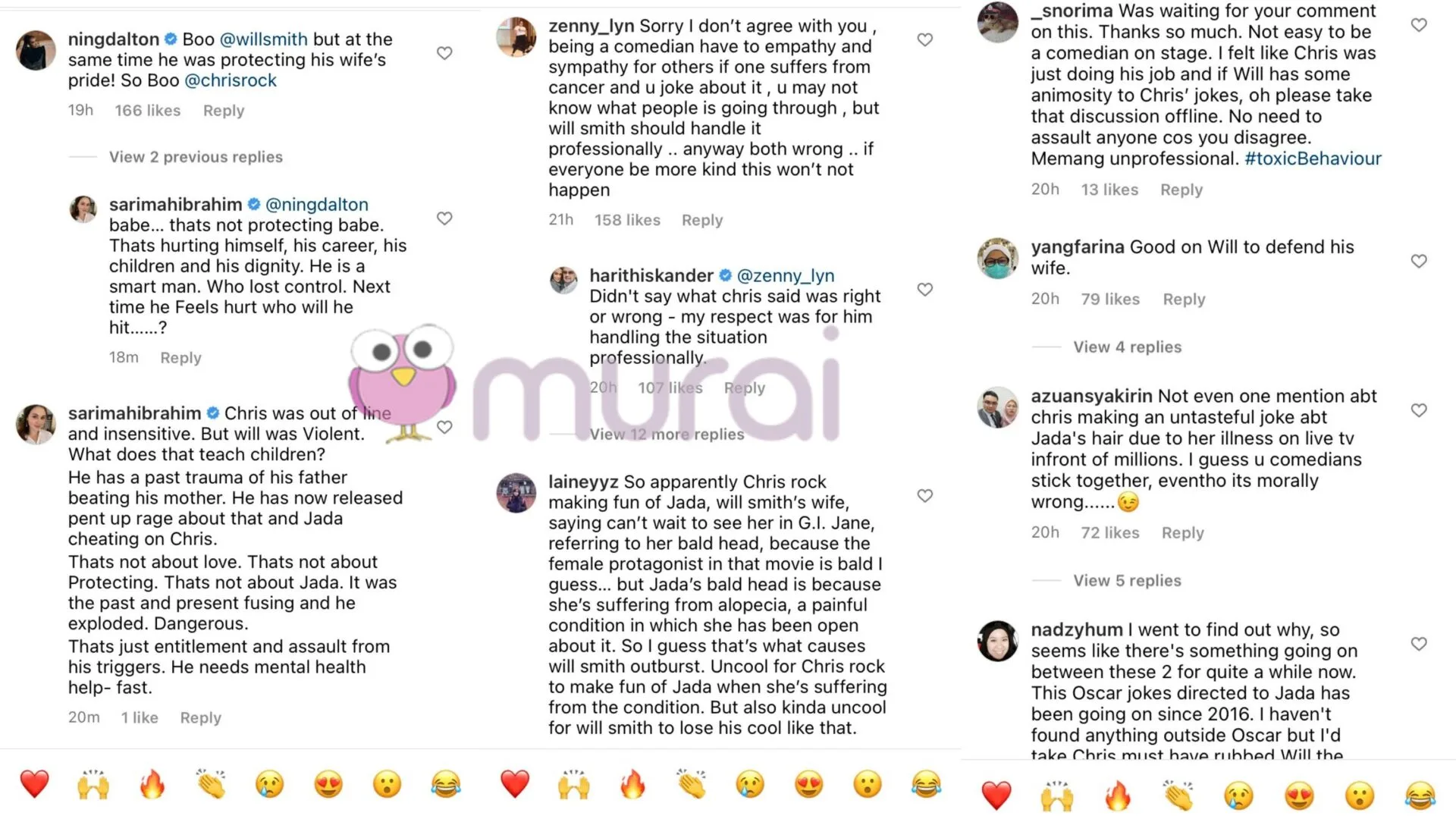 “Maaf saya tidak setuju dengan anda, menjadi pelawak komedi harus ada rasa empati dan simpati pada orang lain jika seseorang menderita kanser dan anda bergurai mengenainya. Anda tidak tahu apa yang orang lain lalui, tetapi Will Smith seharusnya menguruskannya secara profesional. Lagipun, dua-dua salah” komen mereka