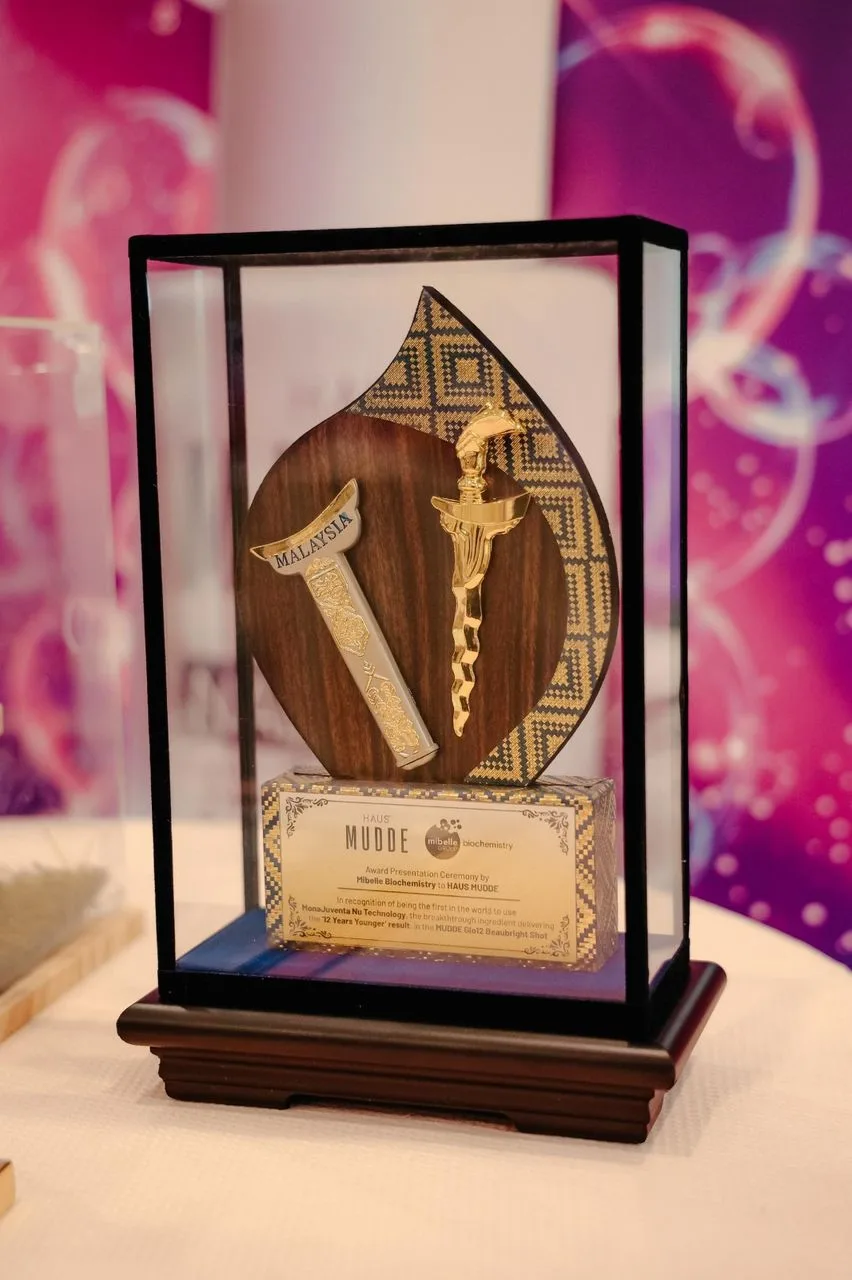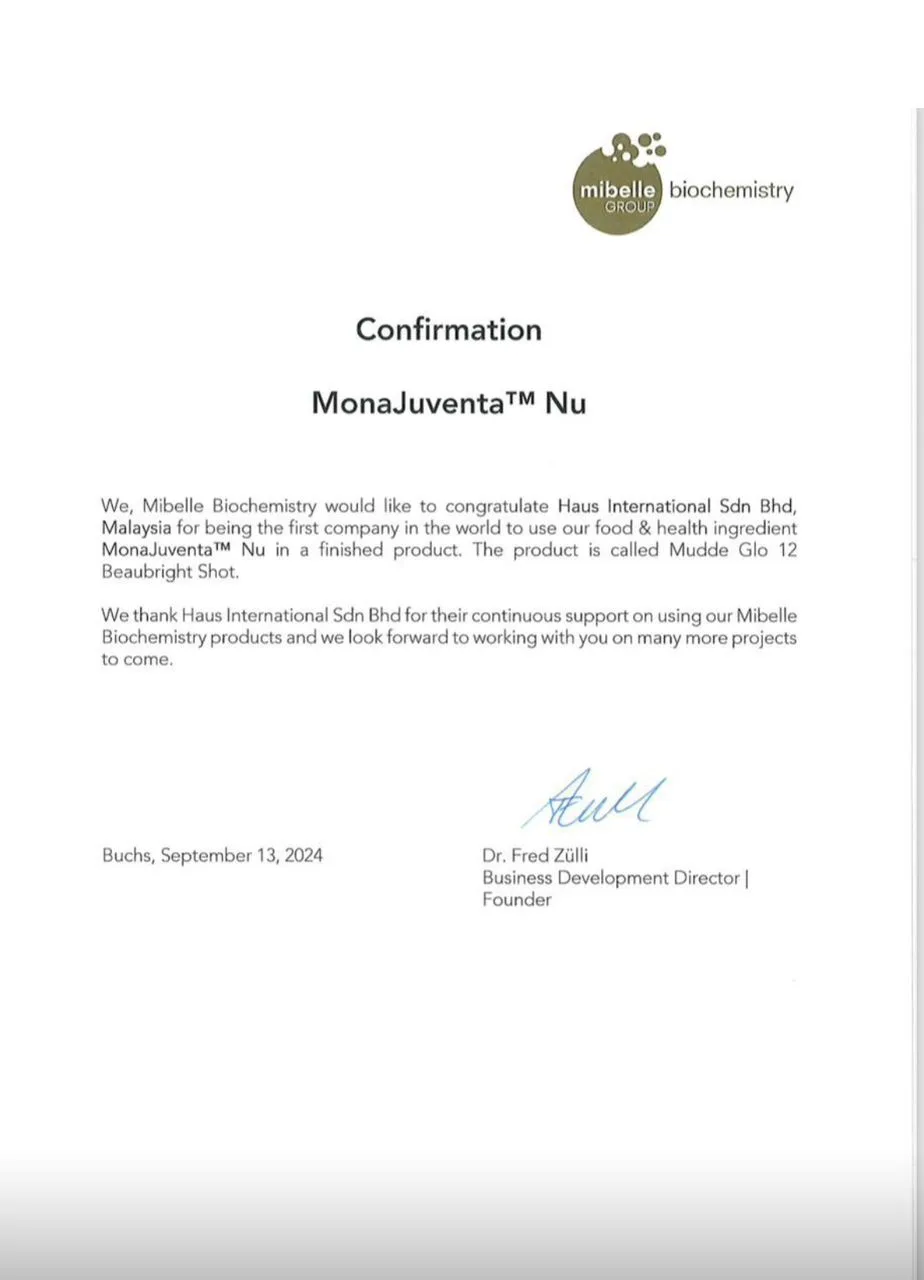 Eiyma menjelaskan bahawa teknologi ‘MonaJuventa Nu’ yang digunakan dalam HAUS MUDDE Glo12 Beaubright Shot menawarkan kesan anti-penuaan yang ketara, menjadikan kulit kelihatan lebih muda sehingga 12 tahun. Selain mematuhi piawaian antarabangsa, produk ini juga dijamin halal, satu faktor penting dalam mendapatkan pengiktirafan tersebut. Kerjasama dengan pakar biokimia turut membantu dalam memastikan kualiti produk terjaga.