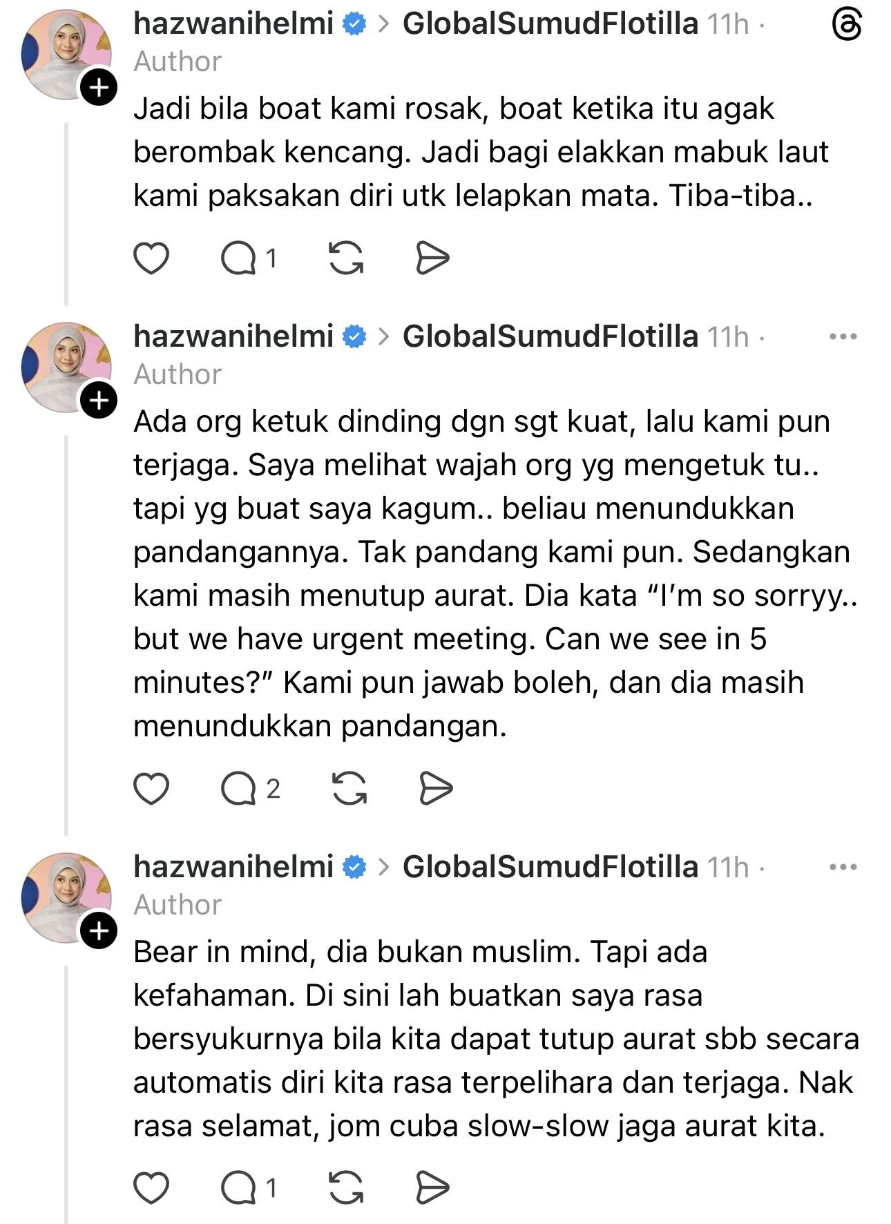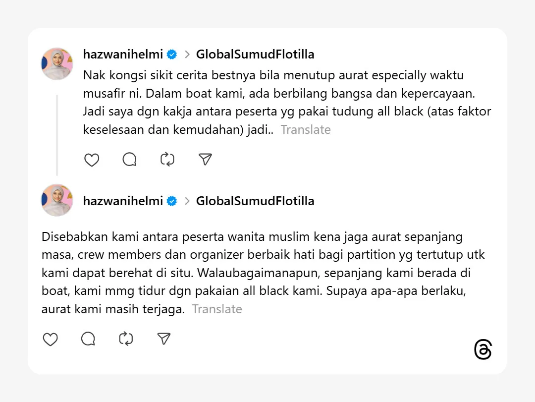 Adik kepada pelakon, Heliza Helmi iaitu Hazwani berkongsi momen indah ketika dalam perjalanan ketika menaiki bot dalam misi Sumud Flotilla, baru-baru ini.