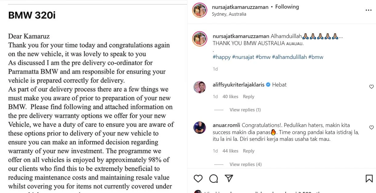 Dalam perkongsian tersebut, Sajat menunjukkan satu gambar komunikasi bersama pihak BMW berkaitan pembelian kereta baharunya. Sajat turut bersyukur dan berterima kasih kepada BMW Australia di atas pembelian tersebut.