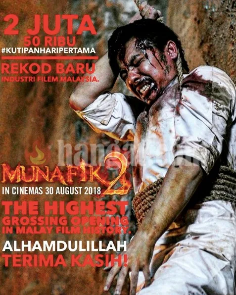 Belum pun ditayangkan secara rasmi, Munafik 2 pada tayangan awal (sneak preview) Rabu lalu telah mengaut RM2.05 juta, sekali gus meleburkan rekod filem Hantu Kak Limah yang mendapat kutipan RM650,000.