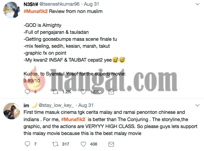 Meskipun filem ini lebih ke arah dakwah dan mistik, namun percaya atau tidak penonton yang berkaum Cina dan India turut mengambil kesempatan untuk menonton filem Munafik 2. Malah kebanyakan pawagam juga ‘full house’ untuk semua jenis pawagam sejak hari pertama tayangannya.