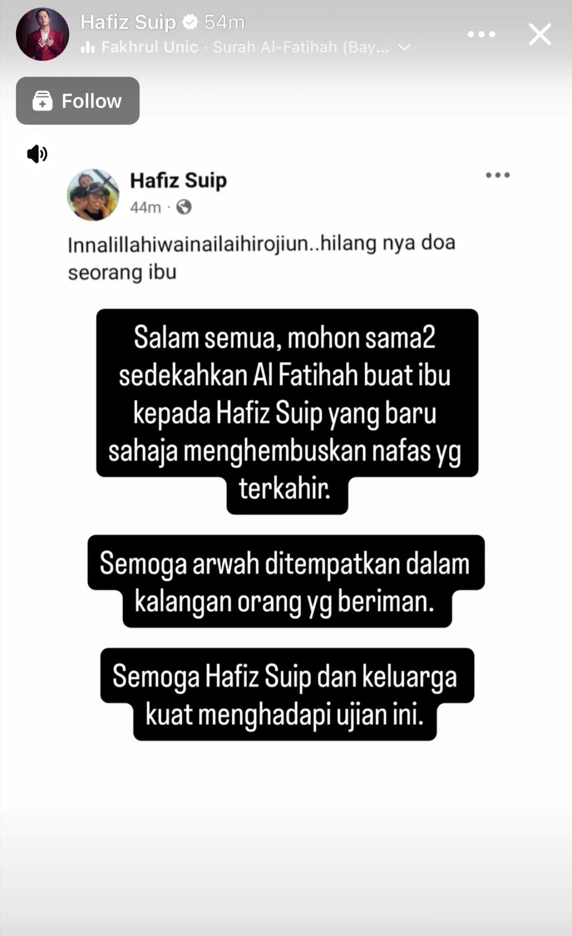 Semoga arwah ditempatkan dalam kalangan orang yang beriman. Semoga Hafiz Suip dan keluarga kuat menghadapi ujian ini.”-kongsi Hafiz di Facebook