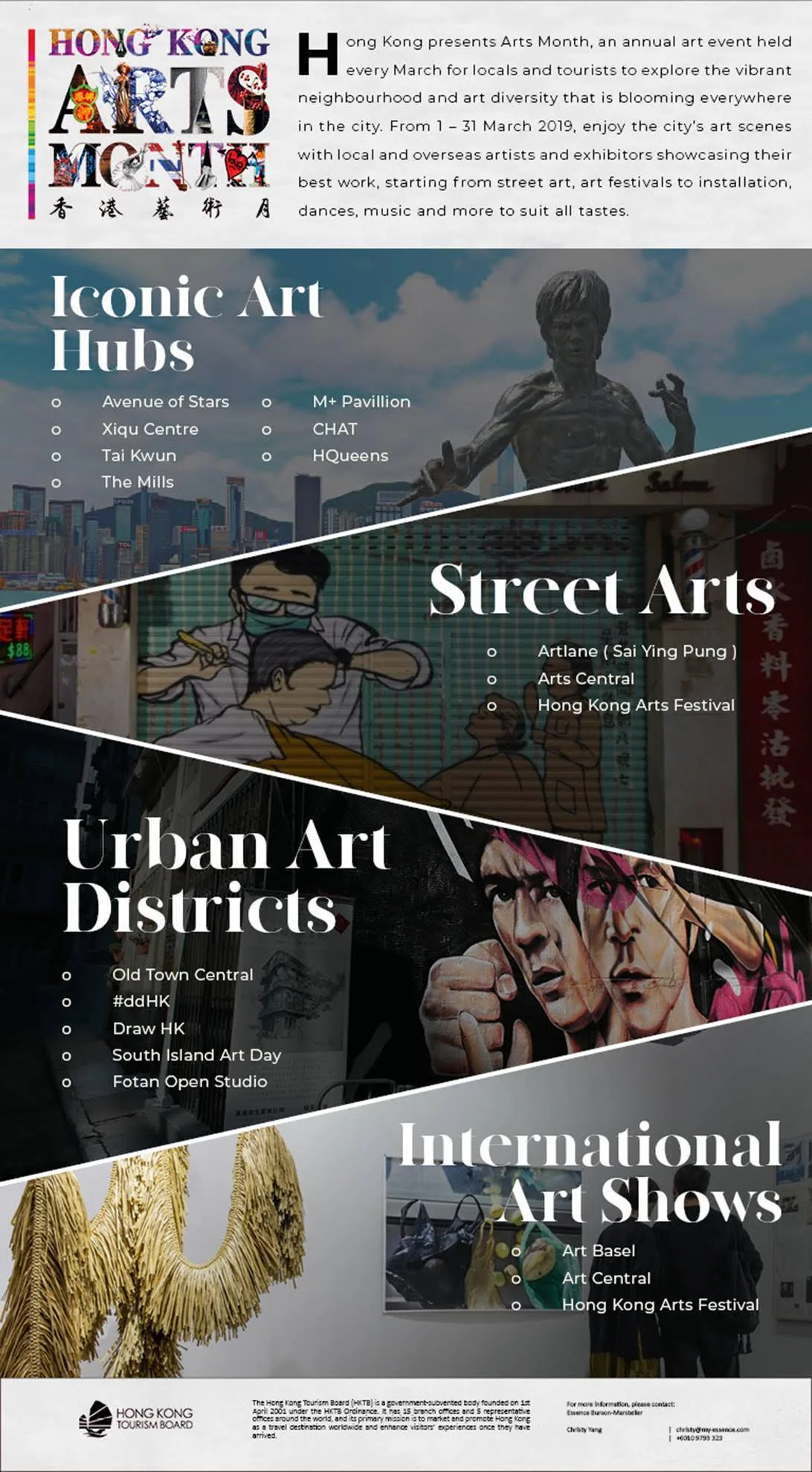 Dan dengan pertambahan tempat-tempat kebudayaan terkini dan karya seni jalanan yang berkembang dalam beberapa bulan kebelakangan ini, peminat seni dan budaya pastinya akan mendapati Hong Kong adalah tempat yang sesuai dalam keasyikan suasana kesenian.