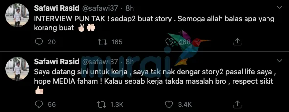 “Interview pun tak! Sedap-sedap buat story.Semoga Allah balas apa yang korang buat” ulas Safawi di Twitter.