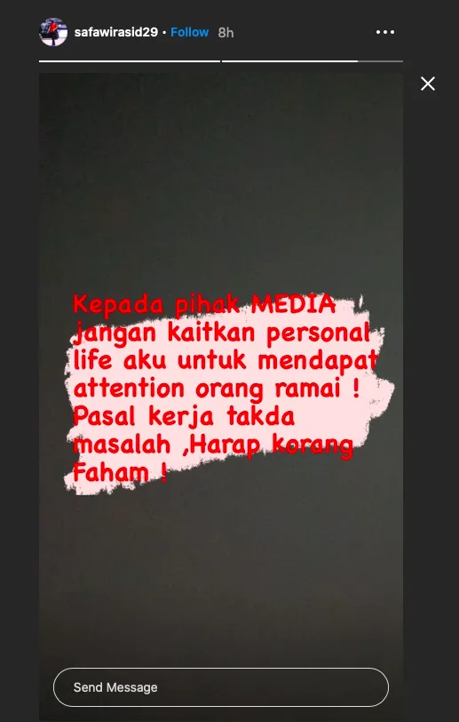 Keberangkatan pemain itu turut ditemani pelakon dan ahli perniagaan, Syifa Melvin di Lapangan Terbang Antarabangsa Kuala Lumpur (KLIA). Terbaru, Safawi menerusi hantarannya di laman Twitter dan Insta-story malam tadi meluahkan rasa geram kerana terdapat segelintir pihak media yang cuba mensensasikan kisah peribadinya.