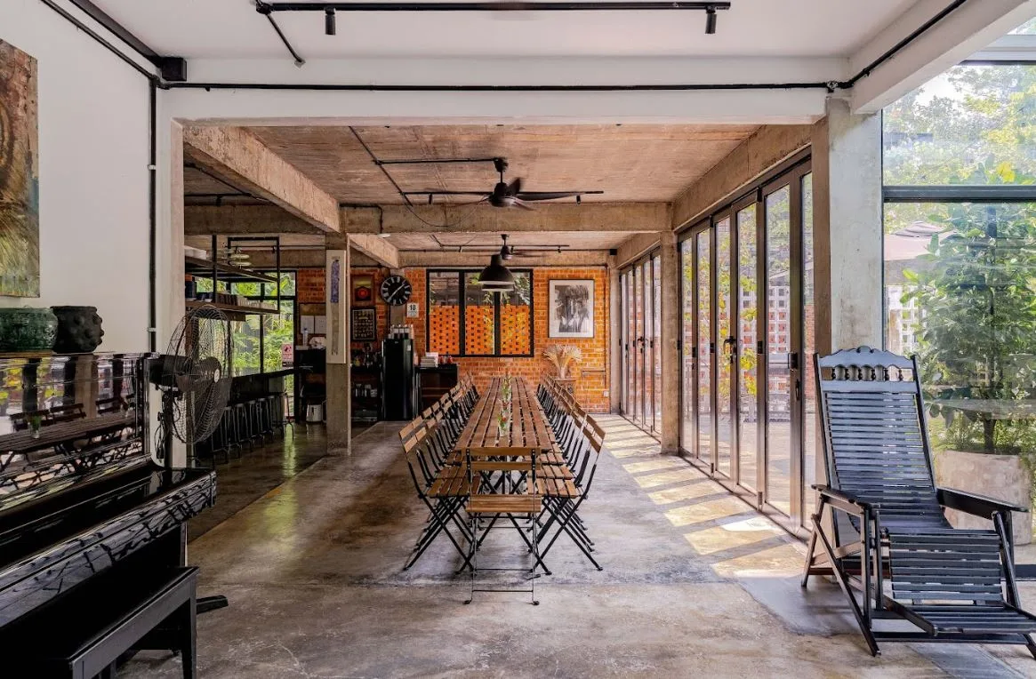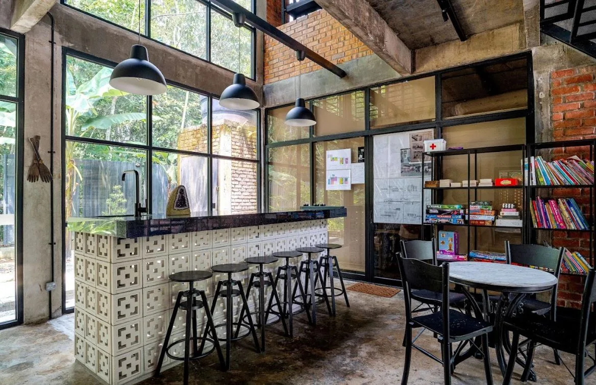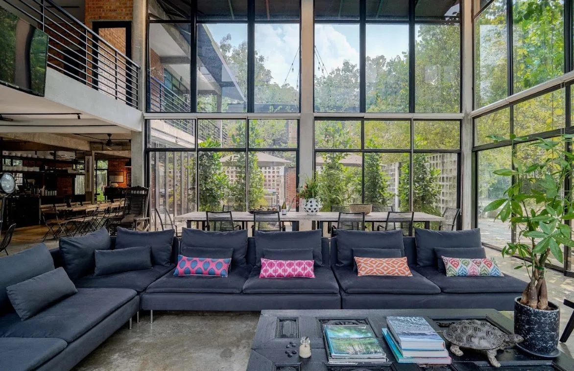 Ruang tamu utamanya mempunyai tingkap kaca dua tingkat yang menghadap sebuah patio yang indah, dapur terbuka yang serba lengkap, kawasan BBQ terbuka dan lubang bakar yang ideal untuk berborak-borak di bawah sinaran bintang.