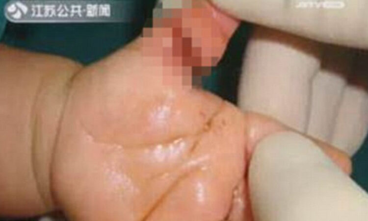 Ibu jari kiri bayi dua bulan di China ini hampir terpaksa dipotong selepas rambut ibunya terlilit tanpa disedari. Rambut dari kepala ibunya itu melilit ibu jari bayi berkenaan dengan kuat sehinggakan anggota badan itu membengkak dengan besar.