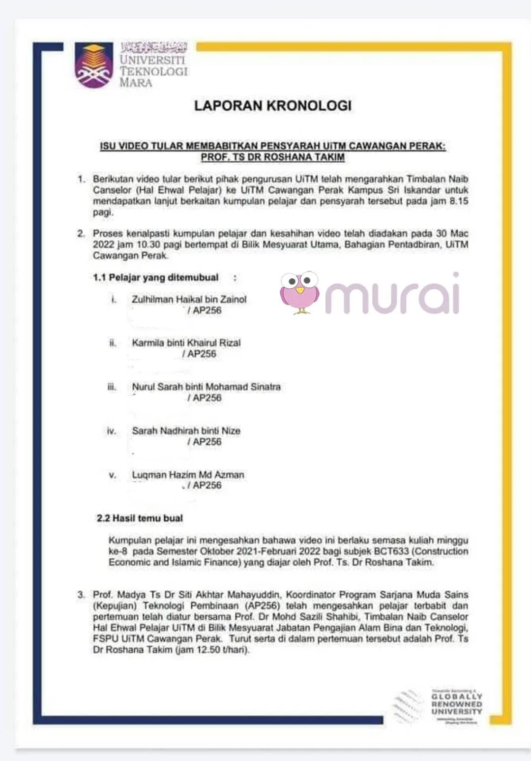 “Kumpulan pelajar ini mengesahkan bahawa video ini berlaku semasa kuliah minggu ke-8 pada Semester ktober 2021-Februari 2022 bagi subjek BCT633 (Construction Economic and Islamic Finance) yang diajar oleh Prof Ts Dr Roshana Takim.” ujar kenyataan tersebut