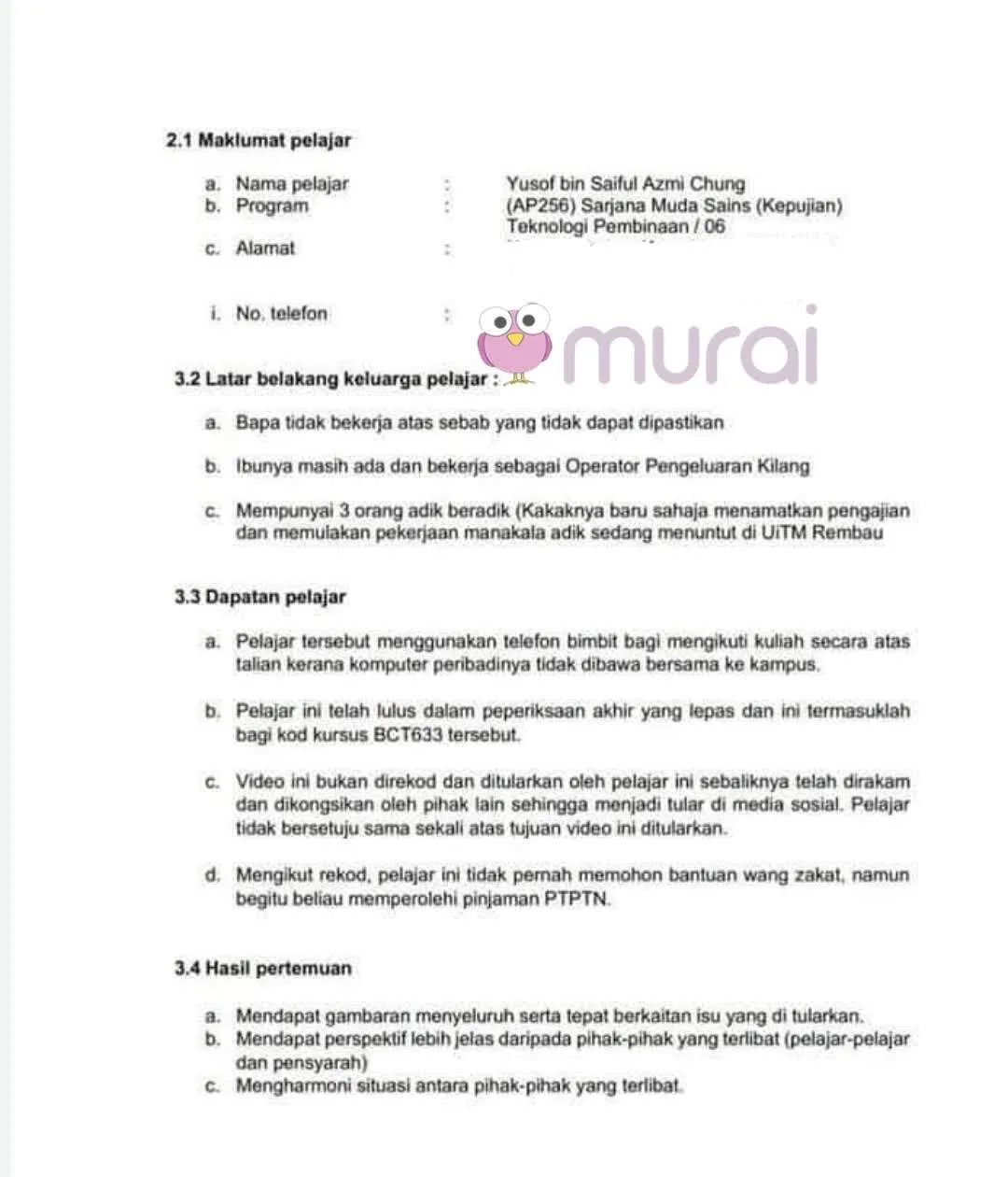 “Bapa tidak bekerja atas sebab yang tidak dapat dipastikan. Ibunya masih ada da bekerja sebagai Operator Pengeluaran Kilang. Mempunyai 3 orang adik beradik (Kakaknya baru sahaja menamatkan pengajian dan memulakan pekerjaan manakala adik sedang menuntut di UiTM Rembau).”