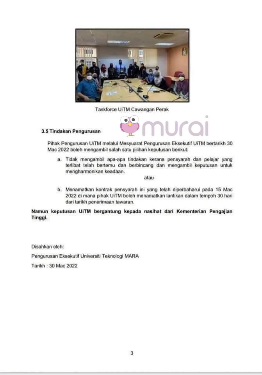 Susulan itu, pengurusan UiTM mencadangkan untuk tidak mengambil sebarang tindakan terhadap pelajar dan pensyarah untuk mengharmonikan keadaan, atau menamatkan kontrak pensyaran itu yang telah diperbaharui pada 15 Mac 2022, di mana pihak UiTM boleh menamatkan lantikan dalam tempoh 30 hari dari tarikh penerimaan tawaran.
