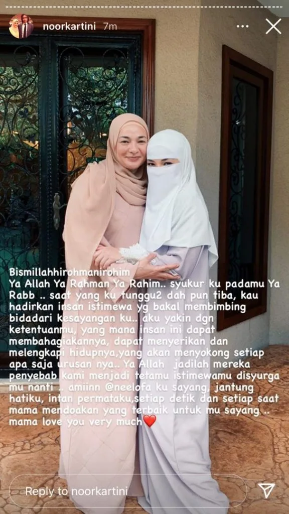 Menurut tinjauan kami di IG Story ibu Neelofa, Datin Noor Kartini telah berkongsi foto dia bersama Neelofa dan menitip ucapan menyentuh hati kepada Neelofa.
