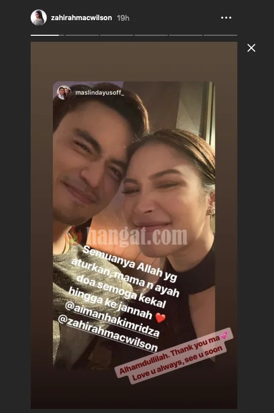 Ucapan itu dibuat Maslida menerusi Instagram nya dimana dia mendoakan agar hubungan anaknya itu bersama Aiman akan berkekalan sehingga ke syurga. Malah Maslida turut berpesan kepada Aiman agar menjaga Zahirah dengan baik. Gembira dengan ‘restu’ tersebut, Zahirah turut mengucapkan terima kasih kepada ibunya.