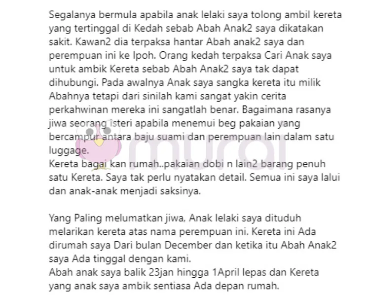 “Segalanya bermula apabila anak lelaki saya tolong ambil kereta yang tertinggal di Kedah sebab abah anak-anak saya dikatakan sakit. Kawan-kawan dia terpaksa hantar abah anak-anak saya dan perempuan ini ke Ipoh. Orang Kedah terpaksa cari anak saya untuk ambik kereta sebab abah anak-anak saya tak dapat dihubungi.