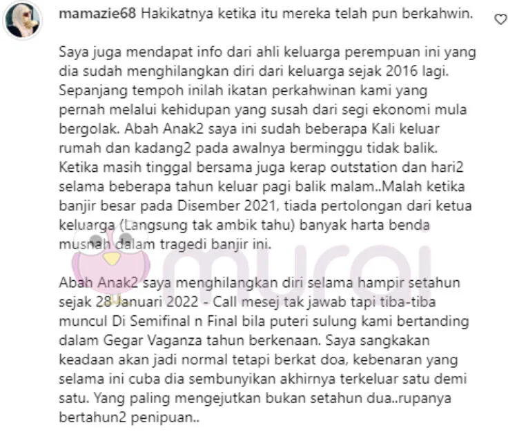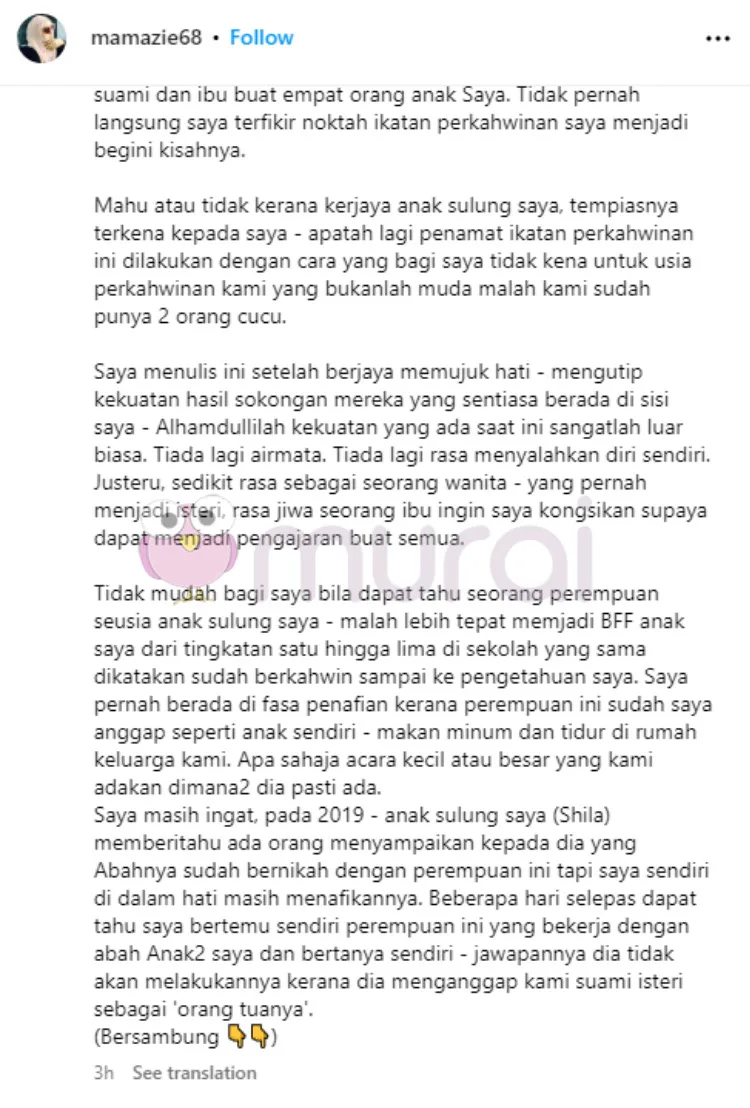 “Pada 2019, anak sulung saya memberitahu ada orang menyampaikan kepada dia yang abahnya sudah bernikah dengan perempuan ini tapi saya sendiri di dalam hati masih menafikannya.