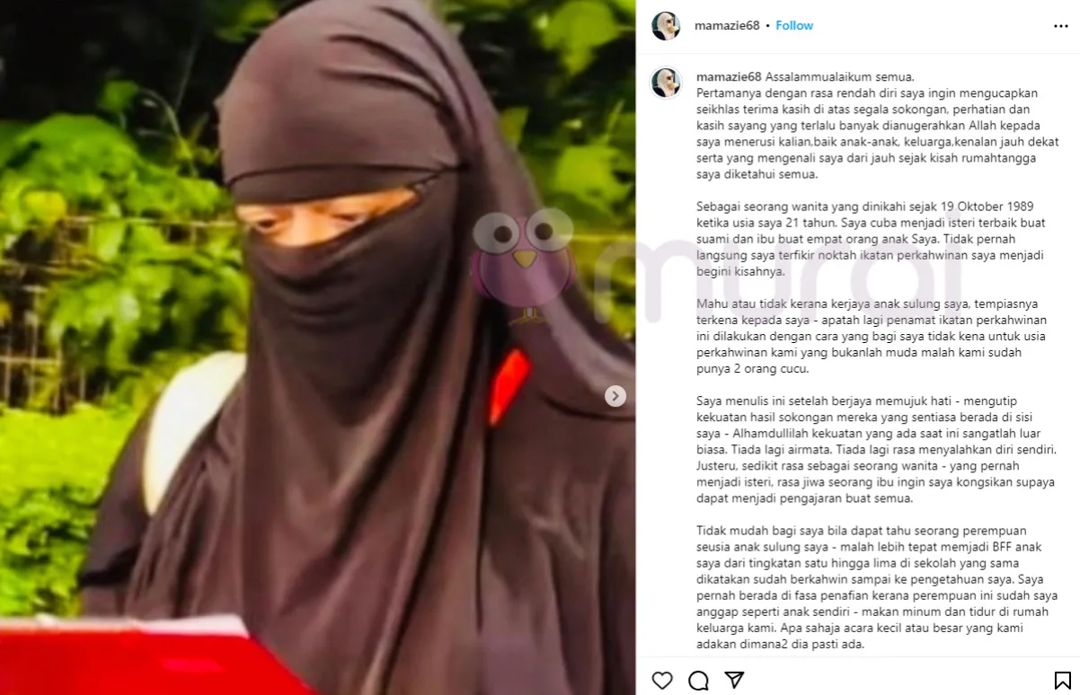 Menerusi hantaran di Instagram, Fauziah mengakui bukan mudah baginya apabila mengetahui wanita yang seusia serta rakan karib puteri sulungnya telah berkahwin dengan suaminya.