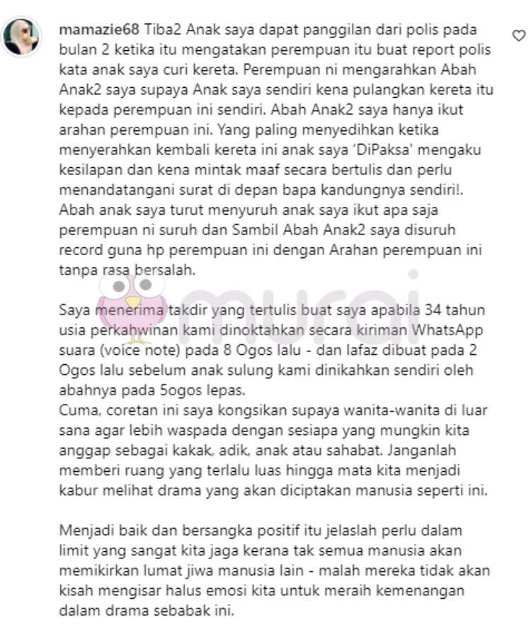 Beberapa hari selepas mendapat tahu, saya bertemu sendiri dengan abah anak-anak saya dan bertanya sendiri. Jawapannya dia tidak akan melakukannya kerana dia menganggap kami suami isteri sebagai ‘orang tuanya’.”-dedah Mamazie