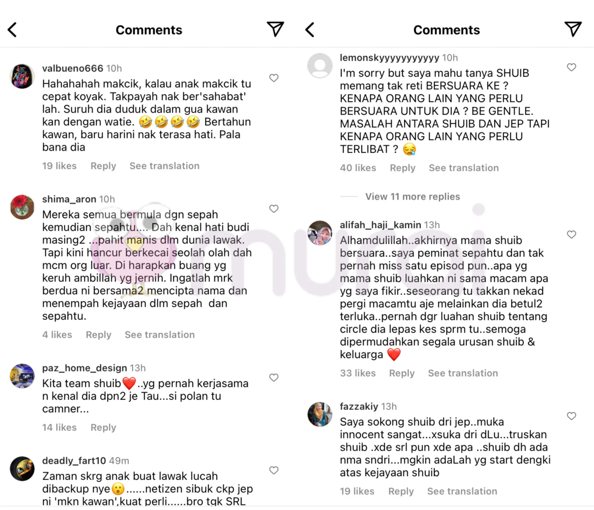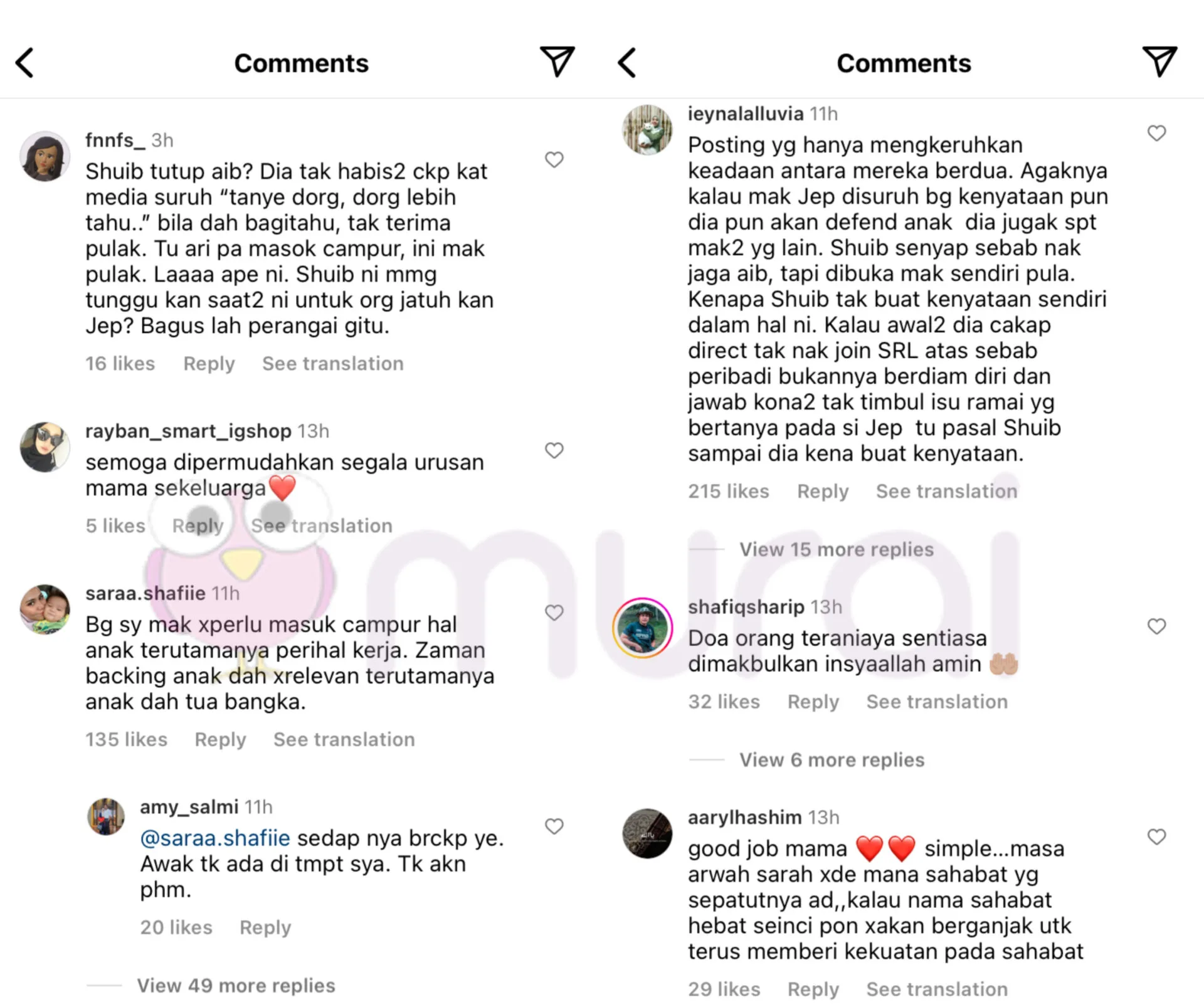 Luahan ibu kepada Shuib itu telah mendapat pelbagai reaksi netizen di ruangan komen, malah ada yang berpendapat adalah lebih baik ibu Shuib tidak masuk campur dalam isu persahabatan di antara Shuib dan rakan seangkatannya yang lain.