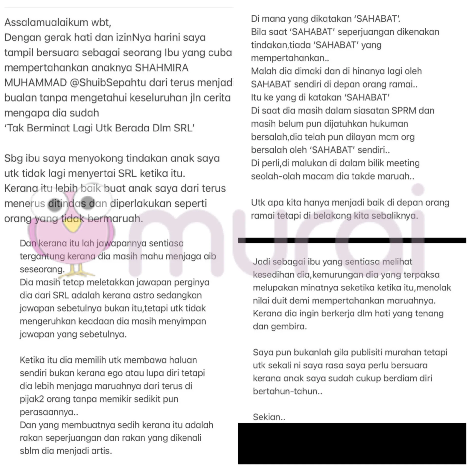 “Sebagai ibu, saya menyokong tindakan anak saya untuk tidak lagi menyertai SRL ketika itu. Kerana itu lebih baik buat anak saya dari terus menerus ditindas dan diperlakukan seperti orang yang tidak bermaruah.”-tulis Salamiah