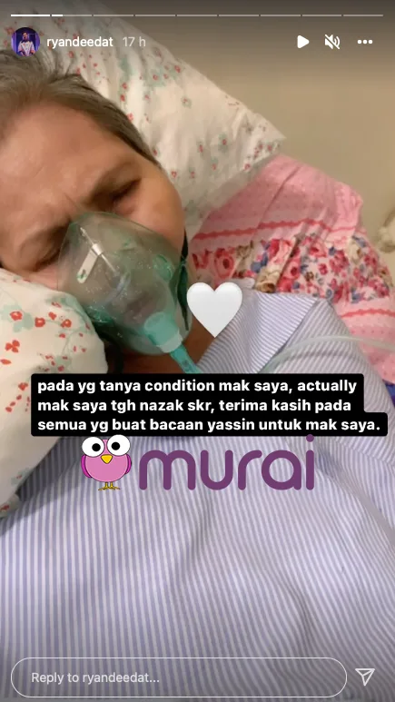 “Pada yang tanya keadaan mak saya, sebenarnya mak saya tengah nazak sekarang, terima kasih pada semua yang buat bacaan yasin untuk mak saya” dedahya