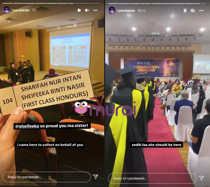 Disebalik memendam rasa hiba, Ryan berasa bangga kerana arwah adiknya berjaya menamatkan pelajaran dengan cemerlang dan memperoleh ijazah kelas pertama. Lebih mengharukan, usai tamat majlis tersebut, Ryan menunjukkan sijil yang diperolehi Sheifeeka kepada ibunya, Tengku Hanasiah Tengku Zainal Mulok,66.