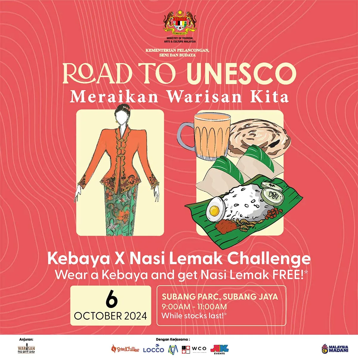 Satu lagi tarikan menarik ialah, pengunjung yang datang berpakaian kebaya atau pakaian tradisional bagi lelaki akan mendapat nasi lemak secara percuma! Ini adalah peluang sempurna untuk menyemarakkan suasana sambil menikmati hidangan kegemaran ramai.