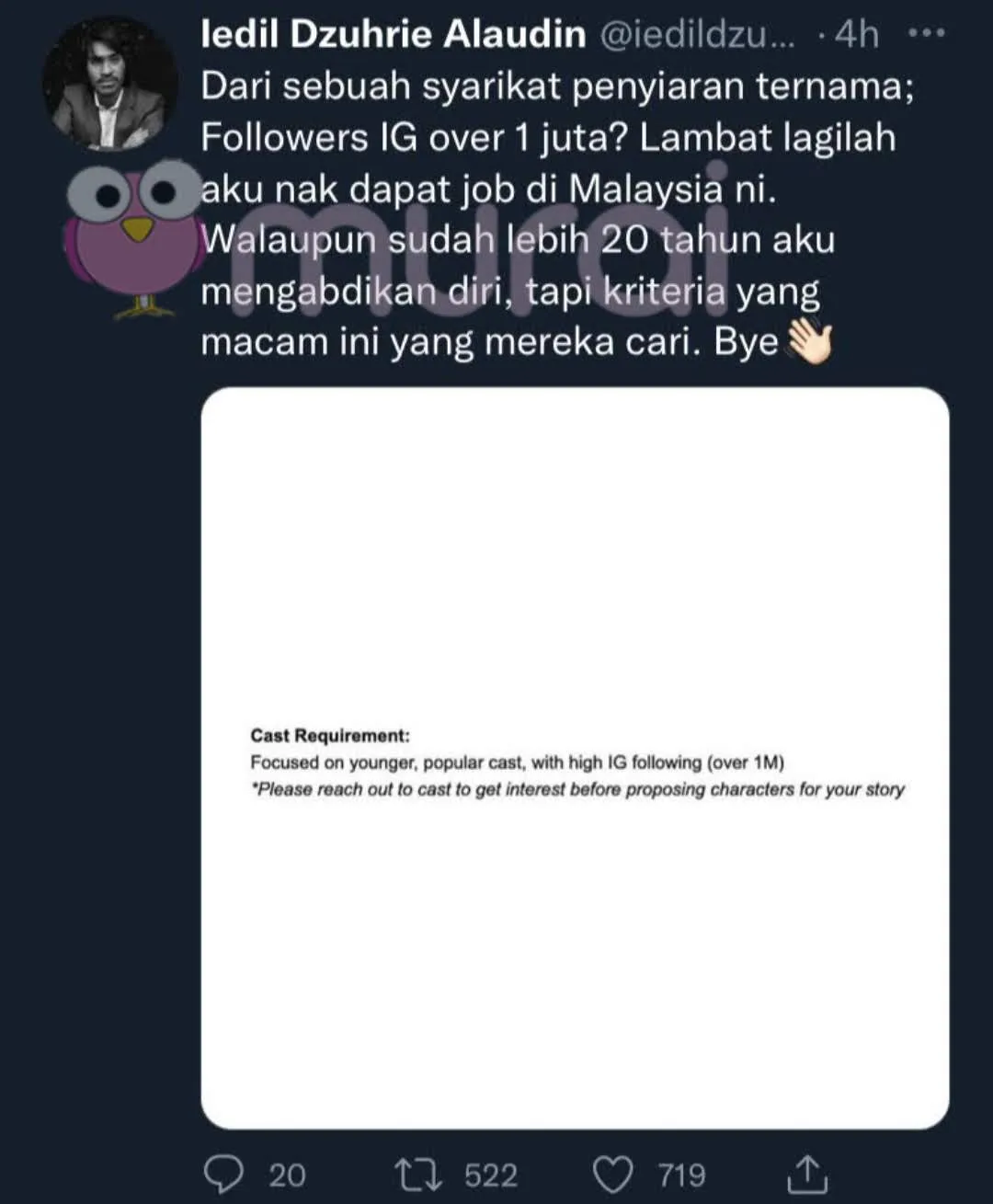 “Dari sebuah syarikat penyiaran ternama ; Followers IG over 1 juta? Lambat lagilah aku nak dapat job di Malaysia ni.