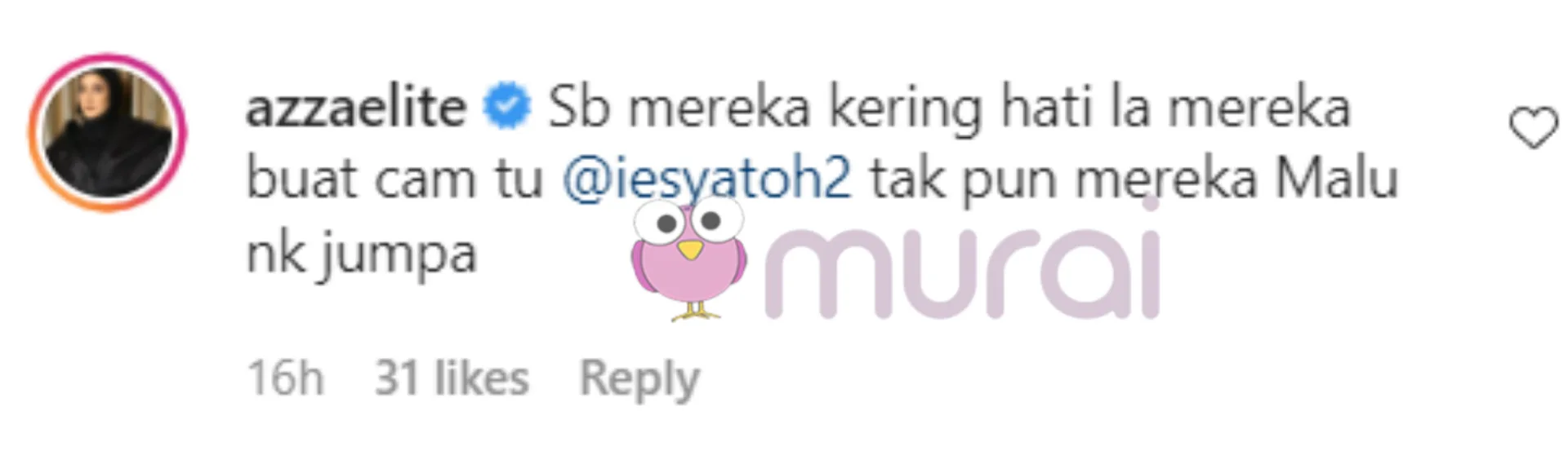 “Sebab mereka hati kering hati laa mereka buat macam tu @iesyatoh2, takpun mereka malu nak jumpa.”-Komen Azza